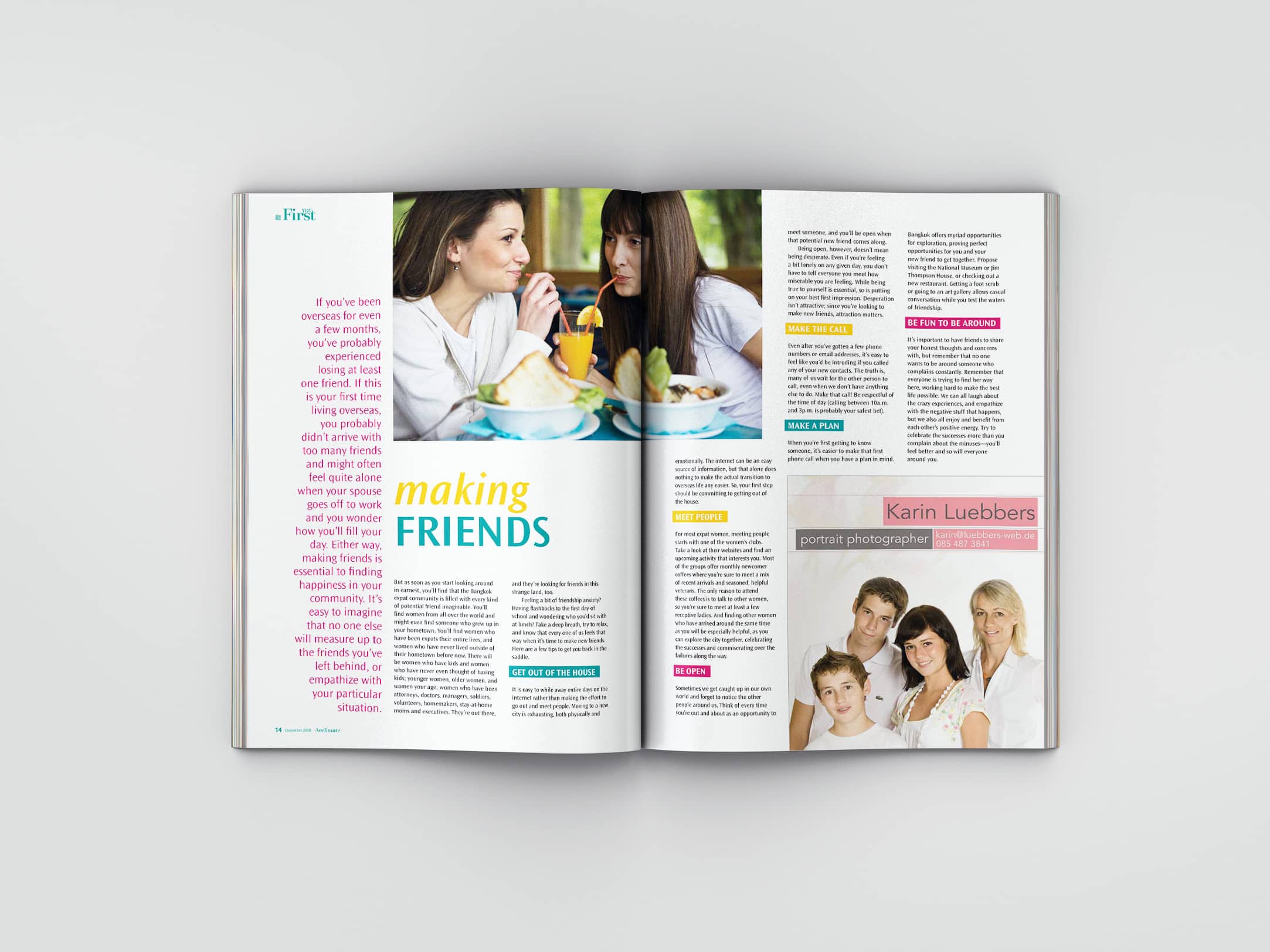 That conversation sparked a collaboration that would grow into Acclimate Magazine — a quarterly publication that ran for two years, with nine issues in total. Tracey served as editor-in-chief, rallying a team of volunteers from the expat community. I helped her shape the brand and design direction from the ground up: concept, layout, typography, production, and everything in between.